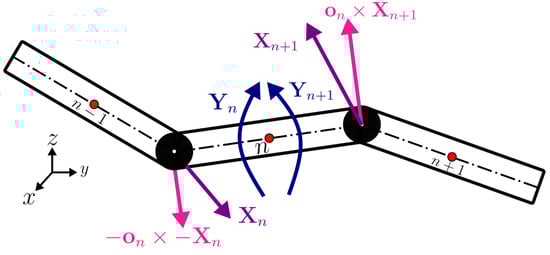 Note that the constraint forces alone would be sufficient to keep the chains of rods together. Therefore, the role of the moments is simply to keep the rod elements aligned, and the generic torque determined by the relative orientation between the th and the nth rod element is given by the following expression: