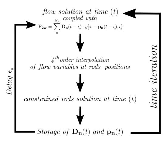 In summary, the ERPP method consists of an extra step that can be easily added to any flow solver for multiphase numerical simulations. As displayed in Figure 6, the method only requires to store, since the start of the simulation and over a suitably-long time window, the position of each element composing the fiber and the drag force experienced by the element. Then, once the delayed time scale has expired, the two-way coupling term can be calculated and added as a source term in the governing equations for the fluid, Equation (2a,b). The array in which and are stored is finally updated, removing the oldest data in the chronology and replacing it with the data at the current time step, thus allowing for advancement of the equations to the next time step.