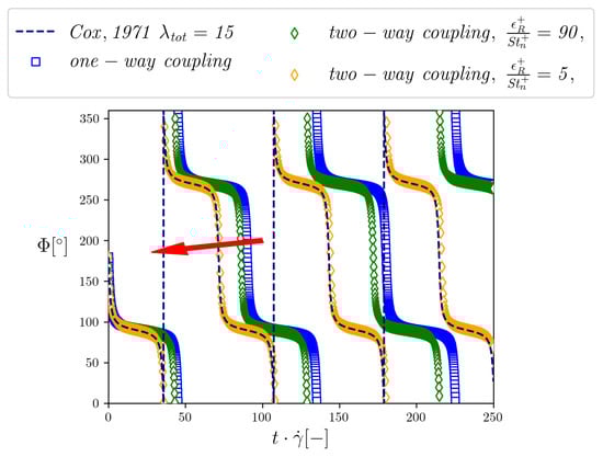 The coarser Eulerian grid adopted for the one-way coupling is perfectly affordable from a computational cost perspective, being made of points. However, despite having imposed the Cox equivalence for each rod-like element, the recovered solution for the whole fiber clearly overestimates the period of rotation, displayed as empty blue squares in Figure 7. A first refinement, obtained by increasing the the number of grid points in each direction by a factor of 2 and by activating the two-way coupling, results in a ratio of 90 between the ERPP time-scale and the element Stokes number, shown as green empty diamonds in Figure 7. We can appreciate a first impact of the two-way coupling, which slightly reduces the period of rotation. Finally, refining once more the number of grid points by a factor of 2 in each direction, the ratio becomes equal to 5, and the solution, displayed as orange empty diamonds in Figure 7, perfectly recovers the semi-empirical correlation of Cox []. In conclusion, the two-way coupling is crucial to obtain a correct solution, in agreement with what reported by Lindstrom et al. []. This is especially true when the ratio between the particle characteristic time-scale and the grid-resolved time-scale is small. The criterion just discussed has been used to estimate the scale up of our calculations and the Eulerian grid needed to properly simulate the targeted fiber-laden turbulent channel flow in the two-way coupling regime.