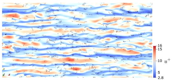 A visual rendering of the modification of turbulence due to the presence of the fibers is provided in Figure 8, Figure 9, Figure 10 and Figure 11, each referring to a different simulation carried out in this study. For each figure, the Eulerian grid is horizontally cut at from the wall and the resulting slice is colored according to the local value of the streamwise fluid velocity. Fibers located within a distance of 20 wall units above the slice are also rendered. The actual fiber length is shown, whereas the fiber diameter is magnified by a factor of five for visualization purposes.