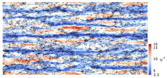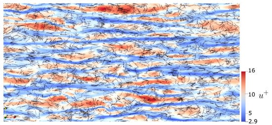 As could be expected, the near-wall flow field modifications appear to be more evident at the higher volume fraction, as shown in Figure 10 for the fibers and in Figure 11 for the fibers respectively. The velocity streaks appear more regular and the spacing between them seems to increase, especially in the case of fibers with higher inertia, in accordance with numerical simulations of turbulence modulation by sub-Kolmogorov spheroids []. From a qualitative point of view, it can be observed again that fibers exhibit a preferential alignment in the low-speed streaks. This is especially visible in the case of inertial fibers, which are able to accumulate more efficiently than tracer-like fibers in the near-wall region by virtue of the turbophoretic mechanism that controls their wall-normal transport. In turn, this leads to an increase of the local (near-wall) volume and mass fractions, which generate a stronger feedback force from the fibers to the fluid.