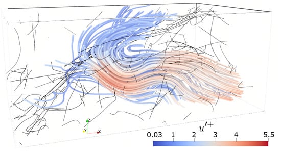 Visualization of the flow streamlines within a volume of size in wall units, centered at a distance of 50 wall units from the wall (for the reference case of fibers and as volume fraction). The streamlines are colored according to the magnitude of the fluctuating fluid velocity. The fibers are also shown, rendered as thin black filaments.