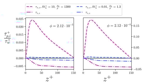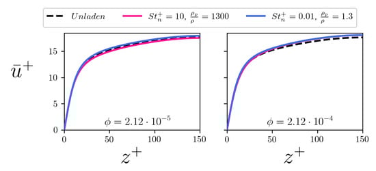 The mean velocity profiles of the fiber-laden simulations are shown in Figure 13. To correctly compare these profiles with those of the unladen case, the velocity is normalized by the shear velocity obtained from the actual mean wall shear stress of the two-way coupled simulation. Only the streamwise velocity component u is plotted, as the other two components have zero mean. Our results indicates that there is a proportionality between the fiber volume fraction and the attained drag reduction, with a higher concentration of particles determining stronger reduction. This effect is more subtle for the inertial fibers. Apparently, an onset volume fraction is trespassed between the two simulations, which leads to a switch from drag increase in the low- case to drag reduction in the high- case. We can quantify these trends by defining the drag reduction percentage as done in []: