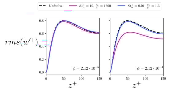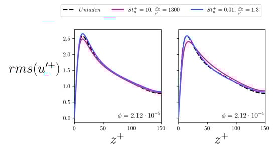 The profiles of the root mean square (rms) of the fluid velocities allow more insight into the physical mechanism that controls drag modulation. The rms of the streamwise fluid velocity is shown in Figure 14 for all the simulated cases. Tracer-like fibers enhance the rms peak, in agreement with the previous simulations with inertialess spheroids []. This rms modulation effect reduces with the volume fraction. Inertial particles, instead, suppress this peak and, at higher , produce a shift of the peak away from the wall.