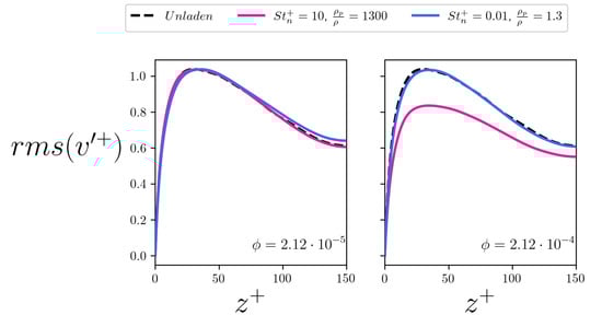 It can also be observed that all the simulations show a gentle increase of the rms profiles away from the wall. This corresponds to a suppression of turbulent activity and an enlargement of the buffer layer, in qualitative agreement with previous studies on polymer-induced drag reduction []. Considering the spanwise rms, shown in Figure 15, tracer-like fibers determine a peak that is located further away from the wall with respect to the unladen case. In addition, at low volume fraction, the mean profile is shifted upwards as one moves away from the wall. This is not observed with the inertial fibers, which appear to shift the profiles downward at increasing volume fraction. Finally, the overall physical picture is coherent also for the wall-normal rms, shown in Figure 16. In this case, all simulations show a gentle reduction, proportional to the volume fraction and to the inertia of the fibers, with the exception of the tracer fibers at low concentration, which seem to slightly detach the profile peak from the wall and increase its value in the center of the channel.