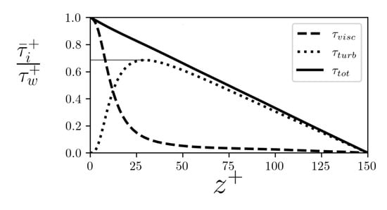 In the flow configuration considered in this study, the mean axial momentum balance in the unladen case is determined solely by the viscous shear stress, , and the mixed axial-wall normal Reynolds stress, . The sum of these two contributions provides the total shear stress, , which is a linear function of the wall-normal coordinate []: