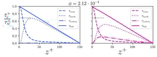 When a dispersed phase is added to the carrier fluid, an extra stress term must be accounted for in the balance. This extra stress is determined by the presence of the dispersed phase, and is generally referred to as particle extra stress in the following. This term is calculated directly from the two-way coupling force, defined as in Equation (7), in the form of a cumulative integral over a given coordinate :
