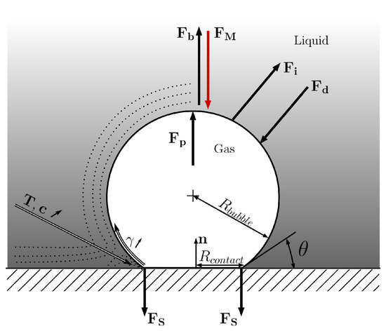 Usually, a balance of forces acting on the bubble is used to determine the diameter that the bubble will have at the time of detachment and the residence time of the bubble on the electrode surface [5]. Depending on the experimental conditions, stagnant electrolyte or electrolyte with a flow, vertical or horizontal electrodes, micro or macro electrode, the intensity and direction of the forces involved in the balance may change. The balance of forces generally includes the surface tension force that holds the bubble on the electrode, the buoyancy force, the inertia force, and the contact pressure force that pulls the bubble away from the surface, and the hydrodynamic forces that act in both directions depending on the experimental conditions. As shown in Figure 1, the balance of forces acting on a gas bubble attached to a horizontal electrode include the buoyancy force, the inertial force, the drag force, the contact pressure force, the surface tension force, the Marangoni force, the normal vector to the electrode. , and the contact angle between the interface and the solid surface are quantities that are involved in the estimation of these forces. The temperature and concentration of dissolved species are higher near the bottom of the bubble. The surface tension varies with the temperature and concentration gradient. This variation is the cause of the Marangoni force.