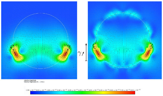 As shown in Figure 3 the spurious currents are not negligible in the case of the CSF method. For the height function method they can be reduced by refining the mesh. The normal component of the surface tension was calculated with the CSF methodology for the simulation of the right image, and the height function and polynomial fit methodology for the simulation of the left image. For both simulations the tangential component of the surface tension was calculated from Equation (28). In the case of the CSF methodology the spurious currents distort the calculation of the Marangoni currents, which is not the case of the methodologies used in the simulation of the left image. In order to obtain an accurate calculation of the Marangoni currents it is important to use a methodology that limits spurious currents.