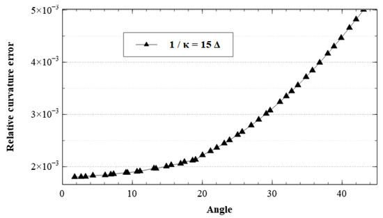Relative curvature errors along the circular interface as a function of the interface inclination angle with respect to the horizontal for two interface resolutions.