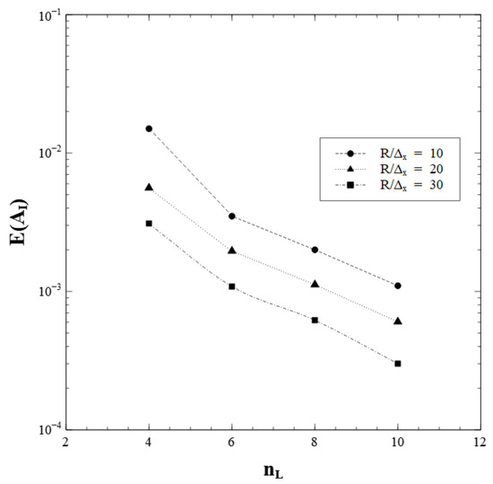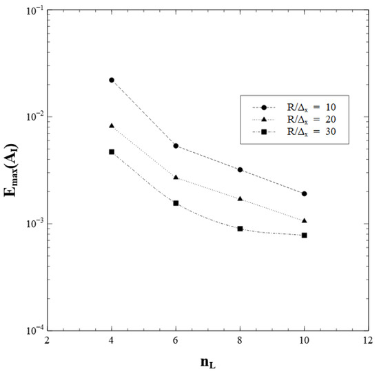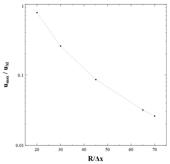 The model has similar behavior to the previous studies [12,20]. As illustrated in Figure 12, the drastic drop in performance can be noticed. Even if the height function method allows accurate curvature calculations, the flaw of the method comes essentially from the advection method. The previous simulation was repeated for different mesh resolutions. The dimensionless quantity used in the abscissa is . As for the static case the method converges when the mesh is refined. We obtain an error of for .