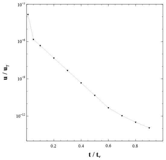 the velocity has been scaled with and the time with . The Laplace number was fixed at 12,000. The results presented here as an example reflect a general trend in the evolution of the spurious velocity over time as observed by Abadie et al. [20]. Popinet notes that these oscillations are proportional to . The advection errors of the models continuously disturb the calculations related to the interface [12].