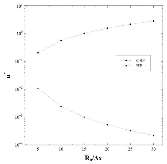 as shown in Figure 11, for the CSF method the spurious currents increase when decreases. Several simulations were performed for different mesh resolutions for each of the two tested models: CSF and the one based on HF. The simulations were carried out for a time equivalent to the experimentally observed growth time of a bubble.