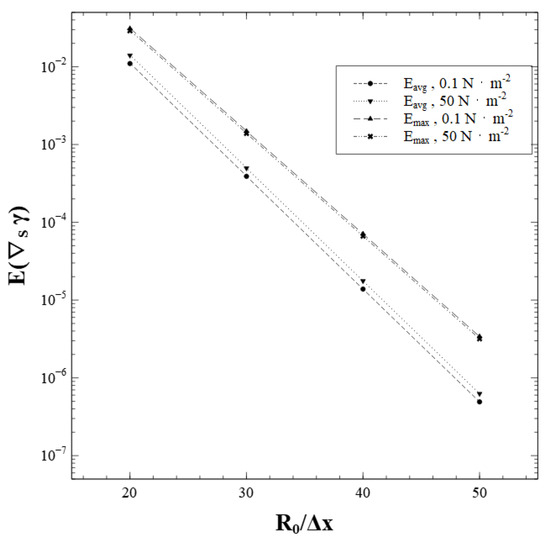 The finer the mesh, the smaller the error. As shown in the graph in Figure 14, the calculated errors are not very sensitive to the value of the surface tension gradient, but they decrease rapidly as the mesh is refined. The maximum and average error are calculated for two values of the surface tension gradient, and . The maximum errors are mainly due to cells where the interface share is small compared with the total cell volume.