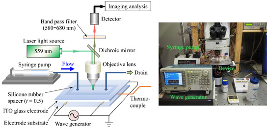 A schematic diagram of the primary part of the experimental setup is shown in Figure 2. The experimental setup mainly consisted of the cell separation device, a syringe pump (YSP-201, YMC, Shimogyoku, Kyoto, Japan) and a wave generator (AFG3151, Tektronix, Beaverton, OR, USA). The device was set on the stage of the confocal laser-scanning microscope (FV-1000, Olympus, Shinjyuku, Tokyo, Japan) and the microscope focus was set on the surface of the counter-interdigitated electrode where heat generation was expected to be most pronounced. The top electrode plate and one of the paired counter-interdigitated electrodes were connected to the ground side of the wave generator, and the remaining one of the electrodes to the high-voltage side of the wave generator using lead wires. The syringe set on the syringe pump was connected to the sample solution introduction port at the microfluidic upstream end via a silicone tube. After the syringe was filled with 5 mL of sample solution and the sample solution flowed into the microfluidic channel at a constant flow rate, using the syringe pump to degas the microfluidic channel, the wave generator was switched on and an AC voltage of 20 Vpp was applied to the device [17]. Fluorescence images were acquired using a laser beam with an excitation wavelength of 559 nm and a bandpass filter with a wavelength range of 570–670 nm. To ensure that the acquired images were free from white-out and black-out, the intensity of the laser light was adjusted by checking the histogram of the fluorescence image brightness to ensure that the fluorescence intensity was within the dynamic range of the detector. Before the electric-field application, the initial temperature of the sample solution was measured and a reference image was acquired at the initial temperature with no voltage application (0 Vpp). The temperature of the sample solution was measured using a T-type thermocouple. After acquiring the reference image, the voltage was applied to the device and we began acquiring fluorescence images at the same time. Time-lapse images of the fluorescence image were acquired every 30 s from the start of the voltage application ( = 0) until = 300 s elapsed. The acquired fluorescence images were stored in an uncompressed TIFF format with a resolution of 1024 1024 pixels. The experiments were performed by varying the frequency f to = 20, 200 and 2000 kHz and the sample solution flow rate to = 5, 10 and 20 mL/h. For the values of and , the same values as those used in the cell separation experiments [17] were used.