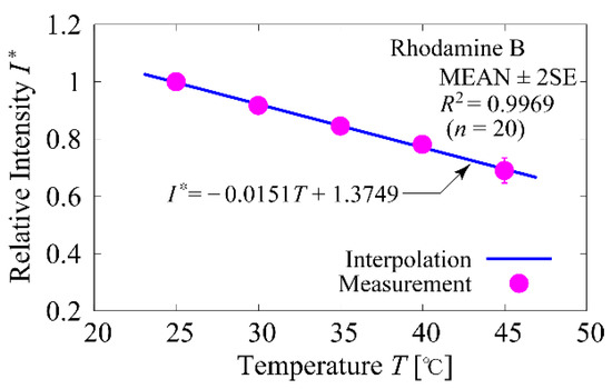 Calibration of the temperature against the fluorescence intensity ratio was performed using a plate reader (DTX-880, Beckman Coulter, Brea, CA, USA). 60 µL of the sample solution was dispensed into 10 wells of the microtiter plate and another 60 µL of 300 mM mannitol solution with solution conductivity = 1 mS/m was dispensed into another 10 wells for background acquisition. The wavelength of the excitation light was set to 535 nm and the wavelength of the bandpass filter to 625 nm, and the temperature in the chamber of the plate reader was changed every 5 °C from 25 °C to 45 °C to acquire fluorescence intensity. For calibration, the background fluorescence intensity was subtracted from the fluorescence intensity of the sample solution acquired at each temperature. The calibration curve obtained is shown in Figure 3. The number of measurements was n = 20 and the plots represent MEAN ± 2SE. Fluorescence intensities were normalized to that at a temperature of 25 °C. The straight line was linearly interpolated by the least-squares method and the coefficient of determination was R2 = 0.9969.