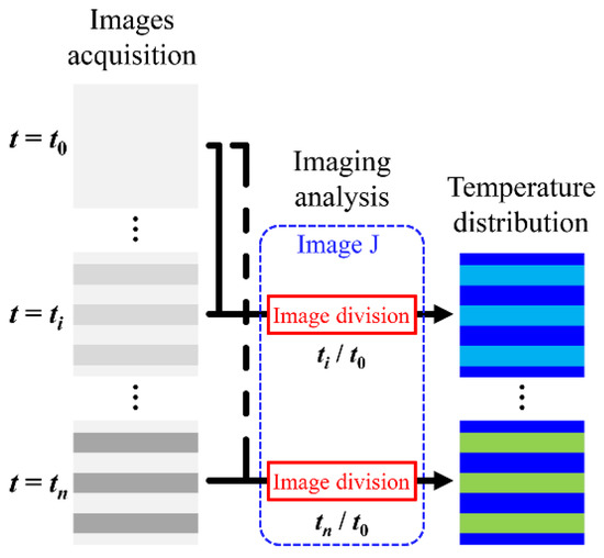The procedure for converting the acquired fluorescence images into images of the distribution of the temperature rise is shown in Figure 4. The NIH (National Institutes of Health) open-source image-processing software Image J (https://imagej.nih.gov/ij/ accessed on 1 July 2022) was used for image analysis. Time-lapse images of the acquired fluorescence images were sequentially read by Image J and converted into images of the fluorescence intensity ratio by dividing each read image by the reference image acquired before the field application. The converted images were then converted to 8-bit (256 shades of grey scale) text images and the intensity values per image pixel were converted to values using the calibration curve. Finally, the distribution of was visualized in pseudo-color using the graphical drawing software Tecplot (https://www.tecplot.com/ accessed on 1 July 2022).