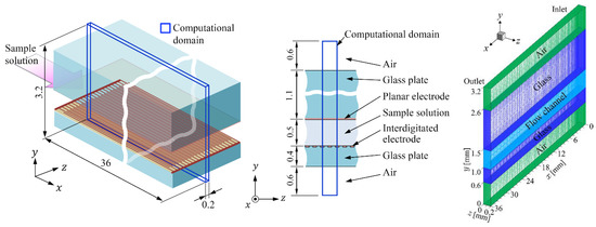 Numerical simulations were performed to predict the temperature rise in the device. The numerical simulation model is shown in Figure 5 together with the computational grid. The dimension of the computational domain was 3.2 (height) × 36 (length) × 0.2 (width) mm. The thickness of the interdigitated electrode was ignored for simplicity. The symmetry boundary condition was applied to both the lateral faces (parallel to the - plane) of the computational domain. In modeling the phenomenon, the effect of natural convection was ignored because the order of the magnitude of the Rayleigh number, , in this phenomenon was . Therefore, it was also approximated that no flows were present in the air layers below and above the bottom and top glass plates, respectively. Consequently, the temperature field could be solved independently of the solution for the flow field. For governing equations, the solution of the fully developed Poiseuille flow