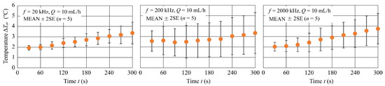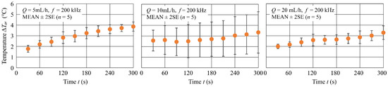 Figure 9 shows the time variation of the average temperature rise at the bottom of the flow channel for three different flow rates = 5, 10 and 20 mL/h. The experimental conditions were = 20 Vpp and f = 200 kHz. The data are statistics for five experiments and the plots in the figure are MEAN 2SE. For all values of , increased with time and reached = 3–4 °C at t = 300 s. In addition, at 300 s showed a trend to decrease with increasing . Results indicate that, at all flow rates, the temperature increased rapidly in the first 30 s and then slowly increased by about 0.7–2.1 °C until 300 s.