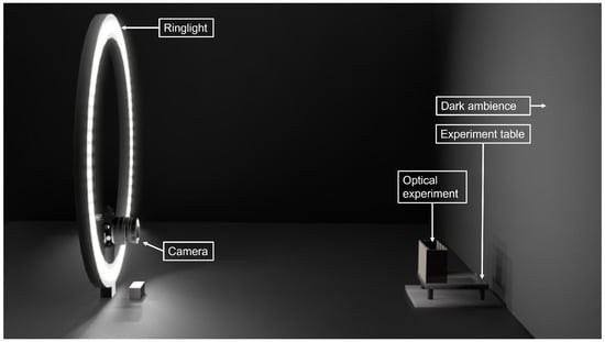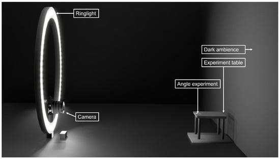 A total of two experiments were carried out. The aim of the first experiment was to investigate the contact angle between the fluid and the different printable filaments. In the second experiment, the transparency of the filaments was investigated depending on the print thickness and illumination. The overall setup for both experiments was almost identical. Figure 1 shows a render of the optical angle measurement setup. A top-down view with measurements is shown in Figure A1, and an image of an exemplary setup for the optical experiment can be seen in Figure A2.