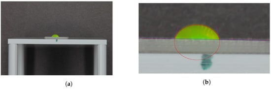 In order to derive the contact angle from the collected image data, computer vision was utilized. The images were centered and cropped around the droplet to minimize processing time and to ensure that only the relevant area was analyzed. Then, the images were converted to a gray-shaded color space and thresholded to separate the background and foreground of the image. From the resulting binary image, a contour along the plate and droplet was derived with the implementation of the OpenCV contour finding algorithm []. Taking this contour, the horizontal border of the plate was derived as a parameterized line with the Hough Transform implementation of OpenCV []. This algorithm is occlusion-insensitive, and can therefore easily derive the straight line from the combined droplet and plate contour. The line was used to extract the contour of the droplet by cropping the contour line with a small pixel margin above it. The droplet contour pixels were transformed into the Cartesian coordinate space. The resulting points were used to fit an ellipse by analytically solving a least-square regression problem. As least square regression is sensitive to outliers, a simple outlier filter was applied beforehand by removing points that exceeded a standard deviation of two sigma.