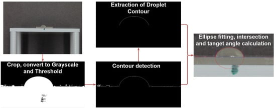 Finally, the contact angle was calculated by intersecting the horizontal line with the fitted ellipse and calculating the angle between the horizontal line and the tangent of the ellipse in the intersection point. Figure 3 provides an example of this processing, and a rough overview of the process with the intermediate images is depicted in Figure 4.