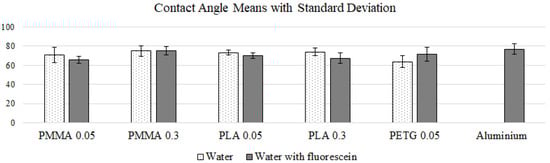 The overall range of contact angles spans from 50.94° to 85.16°. This does not include the 20 measurements for PETG 0.3 mm, as the test plate was soaking up the fluid, acting as a sponge. For this reason, nine of the twenty measurements lead to contact angles higher than 85.16°, of up to 163.63°. Additionally, three of the ten images for PETG 0.3 with dyed water were not interpretable by the evaluation software as a result of the test plate malfunction. The measured values for PETG 0.3 are included in Table 2. The sponge effect and resulting measurements lead to the standard deviation being about five to ten times higher than that of the other measurements. Due to these measurements, PETG 0.3 is excluded from Figure 7 as it distorts the plot scale and is not comparable.