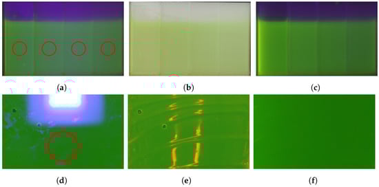 Figure 8 shows examples from the 3D printed PMMA tank (top) and the reference tank (bottom) under different lighting conditions. In total, three illumination settings are under investigation. In Figure 8a,d, the tank is illuminated from the front with a UV light source, while in Figure 8b,e it is illuminated with an white ring light. To minimize reflection on the front wall of the tanks affecting the color stamp, in Figure 8c,f the tanks are illuminated with UV light at a 45° angle from the left. As can be seen in Figure 8d,e, frontal illumination results in large reflections.
