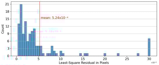 An automated and statistical approach is preferred over manual measurement in order to avoid human error as well as to saving time by not requiring manual evaluation of hundreds of pictures. However, the automated approach showed significant disadvantages, despite being consistent for most of the dataset. Noisy edges due to fibers or additive material residues caused issues in processing, and necessitated manual tuning of hyperparameters. Two pictures had to be neglected because either the algorithm could not derive a horizontal line or fitted the ellipse wrong, which a human interpreter could have measured accurately. Overall, this is an acceptable quota of successful fits for the evaluation. The only exception is the PETG measurement series, due to its high standard deviation. To make the algorithm more stable and improve its overall accuracy, several aspects could be improved with respect to measurement and evaluation. Due to the angle the pictures were taken at, a slight, positive bias is introduced by the fact that the horizontal line is dictated by the bright front face. The edge of this face sits sightly below the actual intersection line at the current viewing angle. Another problem is the low contrast between foreground and background. A matte black background behind the droplet and white surroundings to avoid the droplet refracting dark materials towards the camera could be used as an improved setup. For a repetition of the experiment, a comparison of the automated evaluation process with adapted open source approaches could be evaluated []. These issues result in relatively large confidence intervals for the single results, which makes it difficult to determine a significant difference in the measurements with and without fluorescence. Due to the tripod used for the contact angle measurements, the camera was not perfectly aligned for all measurements, which is clearly visible if one compares Figure 3 and Figure 4; in Figure 4, the top side of the sample plate is visible, while in Figure 3 it is not. This difference occured due to manual correction of the height and angle of the camera and subsequent misalignment due to fastening of the tripod head. As the droplets retain their half-ellipsoid shape, it is assumed that the contact angle error stemming from this source is smaller than the distribution of angles due to the surface texture resulting from the FDM manufacturing process. To assess the uncertainty associated with our measurements, Figure 9 shows the distribution of residuals of the least square regression. Displayed are the residuals of all fitted ellipses in pixels. The mean residual is marked in red. It is clearly visible that the fit uncertainty is in the subpixel range, and therefore negligible.