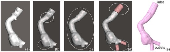 Main steps of the patient-specific aneurysm reconstruction from the Angio-CT medical images of a ruptured aneurysm: (a) rough segmentation (ITK_SNAP), (b) virtual repair and cut of minor arteries (Meshmixer), (c) global smooth (VMTK) (d) insertion of extensions (VMTK), (e) surface extraction (SpaceClaim).