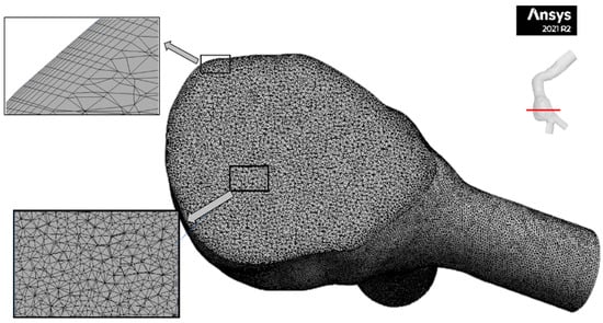 In this perspective, numerical simulations were performed under pulsatile flow conditions, using the representative vascular geometry obtained from the segmentation process. A computational mesh was generated with the ANSYS meshing software, with a refinement near the wall in order to capture the high velocity gradients in that area (Figure 3).