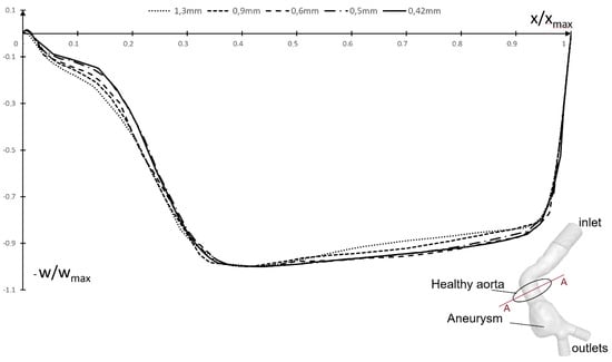 Dimensionless w-velocity at systolic peak instant (t = 0.25 s), plotted in section A-A passing from the healthy aorta to the aneurysm, for different sizes of the mesh element: 1.3 mm, 0.9 mm, 0.6 mm, 0.5 mm, and 0.42 mm.