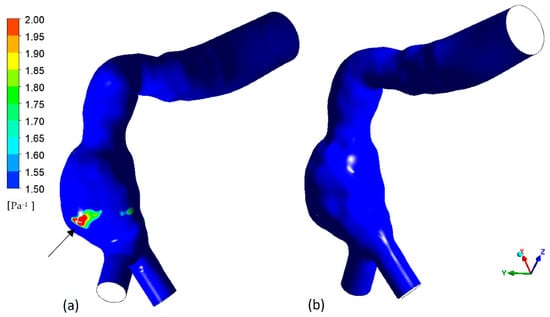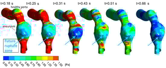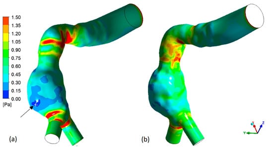 The temporal and spatial distribution of WSS inside the rupturing abdominal aortic aneurysm was due to its specific geometry, which caused flow separation and the consequent emergence of recirculation regions. As highlighted in Figure 7, an altered WSS was found in the aneurysm concerning the physiological values that characterize the non-diseased artery. During the entire cycle, lower WSS compared with the values in the healthy aorta were found on the aneurysmal wall, in agreement with literature results [,,]. Relatively high values characterized the proximal and distal regions of the aneurysm. High WSS were also found in the iliac arteries, due to their tortuosity and the narrowing of the vessels, but these areas are not of interest in this study.