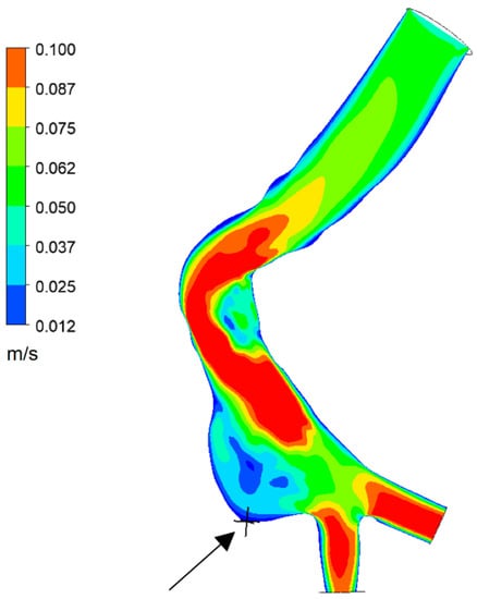 Furthermore, a no-slip condition was imposed on the walls, and the aneurysm wall was assumed to be rigid, due to the fact that abdominal aortic aneurysms become stiffer with the progression of the disease [,]. This last assumption is also supported by degradation of elastin and increase in collagen fibers of the aortic wall that characterize the aneurysm growth [,,].