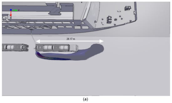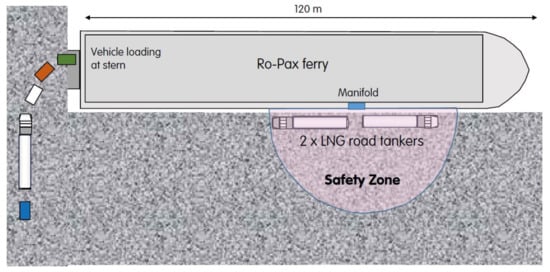The leak scenario used for comparison is the LNG bunkering of a Ro-Pax ferry in Hong Kong. The Ro-Pax ferry fueling was performed with a 4-inch hose, using a pump from two LNG road tankers filled at 2.5 bars and pumped to 6 bars. The ferry’s manifold is located in the hull, 10 m below the main deck. The hose has a minimum height above the ground of 0.1 m. The emergency shut down (ESD) system is semi-automatic, acting after 120 s. Considering a 6 mm leak hole in a 4-inch hose, the BASiL model predicted a horizontal jet radius of 27 m from the leak source []. Figure 1 is an illustration of the bunkering setup and the semi-circle in pink represents the safety zone.