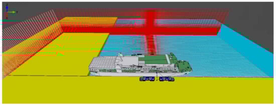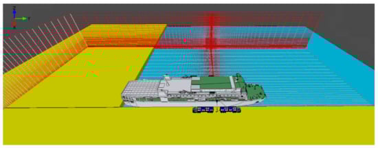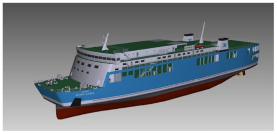 The ship model was based on Adinda Windu Karsa, a Ro-Pax ferry working in the Indo-Java Sea []. The ferry measures 114.8 m by 22 m and the freeboard height is approximately 13.2 m above the sea surface. Figure 2 is a picture of the Ro-Pax ferry model used in the CFD simulation.
