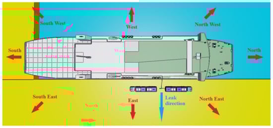 The LNG truck tankers model was based on the Mercedes Benz Actros truck series. The two trucks were modeled back-to-back, each connected to a trailer loaded with two 20-foot tanks. A pump was located between the two road tankers to transfer the LNG into the Ro-Pax ferry. The road tankers, pump, and Ro-pax vessel positioning were identical to Figure 1. Figure 3 shows the horizontal plan view of the model, the modeled wind directions (red arrow), and the LNG leak direction (blue arrow). The leak direction was chosen to be east because the leak would not be impinged and give a conservative result. The breach leaked horizontally at a height of 0.4 m above the ground.
