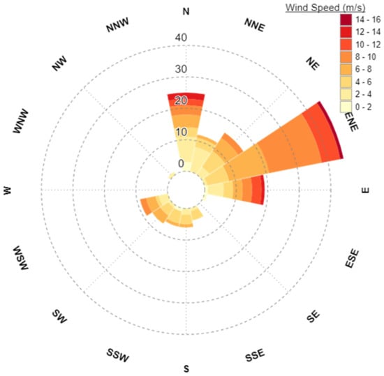 Based on Hong Kong January to May 2021 weather statistics, the initial conditions were set as an average temperature of 22.25 °C and 1 bar ambient pressure []. Ground roughness was set at 0.03 m because the terrain has few obstacles. The chosen solver was transient mode. Courant number (CFLC) based on sound velocity was set at 5. Courant number (CFLV) based on flow velocity was set at 0.5. The Hong Kong observatory wind record for January to May 2021 is presented as a wind rose in Figure 6. The prevailing wind direction is East North East (ENE). ENE mean wind speed is 8.1 m/s (elevation of 32 m above sea level) with a standard deviation of 2.38 m/s. Wind speed higher than the mean is associated with rainy weather which prevents LNG bunkering from taking place. Nubli and the team have concluded that lower wind speed leads to bigger gas dispersion []. To be conservative, only wind speeds at the mean speed and below were considered for the CFD simulation. Three wind speeds, 8.1 m/s (mean), 5.7 m/s (minus 1 standard deviation), and 3.3 m/s (minus 2 standard deviation) were selected for the simulation. These wind speeds cover the 5th to the 50th percentile wind speed distribution. The ENE wind profile was used for all the wind directions because no specific Hong Kong site was used in this study. Eight wind directions blowing north, northeast, east, southeast, south, southwest, west, and northwest were considered in the study. Pasquill stability class was set as neutral (D).