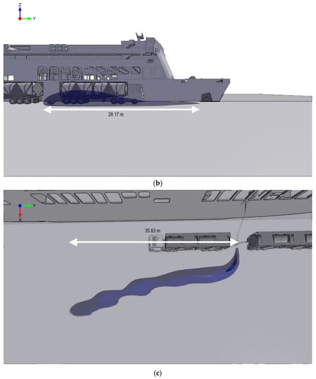 Marko and colleagues compared the LNG pool dispersion results from PHAST, FDS, and Ansys Fluent at the port of Koper, Slovenia []. The results show that all three models produce comparable results for the gas dispersion distance on flat terrain. It was concluded that PHAST is not reliable for LNG leaks that occur near lower structures such as piers, houses, and moored ships. This is because the integral model does not consider the heights of geometry and will not capture the stratification of a vaporization gas cloud. The presence of the ship significantly influences the dispersion of the gas cloud shape and length. This paper concluded that CFD should be considered for gas dispersion in ports with a defined gas evaporation rate obtained from experimental tests or simulated separately and validated for a specific spill case.