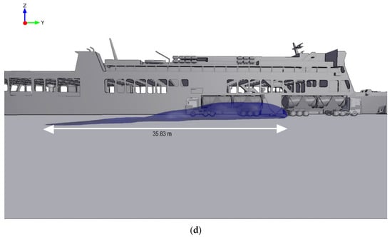 The CFD simulation was performed using a Dell Precision T7820, equipped with dual Intel Xeon Gold 6150 2.7 GHz processor and 128 GB (8 × 16 GB) 2666 MHz DDR4 RAM. CFD software FLACS version 20.1 simulated the leak scenario of the Ro-Pax ferry for comparison. FLACS used the finite volume method on a structured cartesian grid to solve Favre averaged transport equations for mass, momentum, enthalpy, turbulent kinetic energy, the rate of dissipation of turbulent kinetic energy, and mass-fraction of fuel. The porosity concept was used to capture the congestion effect of geometries within the cartesian grid which affect gas dispersion. The governing equation for gas transport equation is as follows: