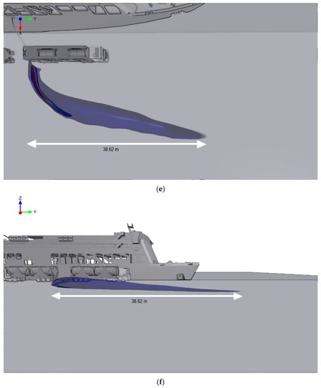 Snapshots of LNG dispersion profiles that exceeded 27 m: (a) Plan view of 5.7 m/s northeast wind, (b) Section view of 5.7 m/s northeast wind (c) Plan view of 3.3 m/s south wind, (d) Section view of 3.3 m/s south wind, (e) Plan view of 3.3 m/s north wind, (f) Section view of 3.3 m/s north wind.
