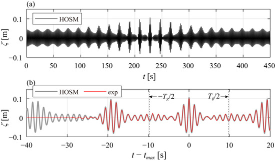 (a) Time series of wave elevation of the modulated wave train with simulated with the HOSM. (b) Enlarged view of (a) around the time of the maximum crest height (), which is compared with the corresponding wave-elevation at m measured in the wave tank.