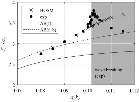 In this section, the maximum crest heights of the modulated wave trains between the HOSM simulation and the WT experiment are compared. Figure 3 presents the variation in the normalized maximum crest height with the initial wave steepness . For reference, Figure 3 also shows the predictions of the AB solution of the NLSE with and without the second-order bound-wave correction. The maximum crest height of the free wave, , and that taking into account the bound wave, , for the AB solution are given respectively by