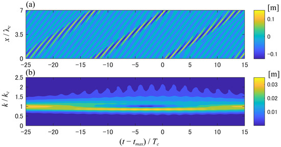 where , , and denote the wavenumber, wavenumber interval, and number of spatial nodes in the direction, respectively. This study only addressed unidirectional modulated wave trains propagating in the direction. The HOSM cannot take into account wave breaking directly because the free surface is assumed to be a single-valued function with respect to the horizontal coordinate . However, when a wave sufficiently steep to break appears in the HOSM simulation, the low-pass filter in Equation (2) removes the energies of high-wavenumber components. Accordingly, the computation can continue to some extent beyond possibly breaking events [38,39].
