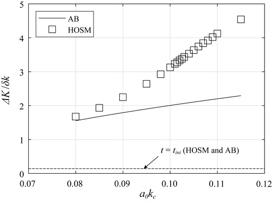 To investigate the dependence of the spectral broadening at on the initial wave steepness, or . (Equation (4)), at in the HOSM simulation is plotted against in Figure 7. The spectral broadening at increases as the wave steepness increases. Moreover, the spectral broadening is larger than that predicted by AB (solid line), which takes into account the second-order bound waves (Appendix A). The deviation becomes larger as increases. From the definition of (Equation (7)), the deviation of is conjectured to be mainly due to the difference in energy at high wavenumbers far from . Indeed, notable deviations in spectral energy between the HOSM and AB are observed at high frequencies in Figure 4. The bound-wave energy is dominant at such high wavenumbers (or high frequencies), as demonstrated next.