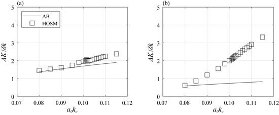 As implied by the relation between and for bound waves, free-wave spectra broaden further as increases (Figure 9). The deviation in spectral broadening between the HOSM and AB becomes larger as increases. This deviation reflects the difference in the free-wave spectral shape at as indicated in Figure 8. The free-wave spectrum can broaden more in the HOSM than in AB because of the different treatments of the spectral bandwidth. The HOSM does not restrict the bandwidth, while the NLSE assumes narrow-banded wave spectra. From the investigation so far, we can conclude that the free-wave spectral broadening and resultant bound-wave production at high wavenumbers result in a larger total spectral broadening of the modulated wave trains in the HOSM than in AB. Janssen [10] has observed a similar relation between the wave steepness and spectral broadening in irregular waves. He has shown that the spectra of irregular waves broaden as the ratio of the wave steepness to the spectral bandwidth increases, owing to the enhanced quasi-resonant interaction.