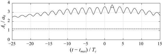 Temporal evolution of the amplitude sum of the modulated wave train with at approximately the time of the maximum crest height () in the HOSM simulation. The dashed line represents the initial value, and the triangle indicates the maximum value.