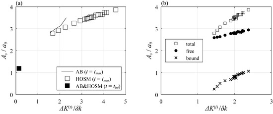 The relation between and is presented in Figure 9a for the free waves and Figure 9b for the bound waves. The difference between the HOSM and AB is greater for the bound waves than for the free waves. This confirms that the primary cause of the difference in total spectral broadening between the HOSM and AB in Figure 7 is the difference in bound wave energy. As conjectured, a significant energy difference is observed between the HOSM and AB at high wavenumbers (Figure 8). The reason bound-wave production at high wavenumbers is more energetic in the HOSM than in AB is the larger free-wave spectral broadening in the HOSM, as will be discussed next. This is because the bound waves are produced deterministically from the free-wave spectrum. Of course, bound waves higher than the second harmonics, not considered in the AB solution, also contribute to the higher bound-wave energy at high wavenumbers in the HOSM results. The bound waves could be evaluated correctly up to the fifth order in the HOSM simulation because this study adopted the nonlinear order .