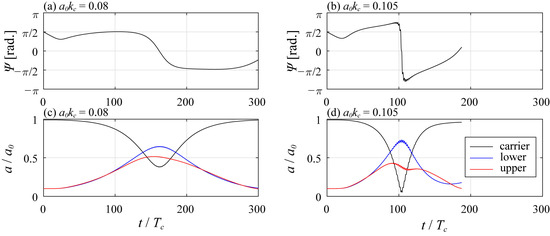 The long-term behavior of for the modulated wave train is first investigated. Figure 15 presents the temporal evolution of together with the amplitude evolutions of the carrier, lower sideband, and upper sideband of modulated wave trains with and 0.105 as examples. Almost a full recurrence cycle is observed for both and 0.105, although the recurrence period is much shorter for than for . Contrary to the theoretical prediction (Equation (12)), Ψ varies in time at the initial stage for both cases. This initial behavior is due to the nonlinear wave initialization of the HOSM simulation explained in Section 2.1. For , remains constant at approximately after the end of the nonlinear wave initialization and then changes rapidly to near the modulation peak (at approximately ). For , varies slowly after the end of the nonlinear-wave initialization and, as is the case with , changes rapidly near the modulation peak (at approximately ). However, its rate of change near the modulation peak is much faster than for . The time when almost corresponds to that when the carrier amplitude reaches its minimum and when the lower-sideband amplitude reaches its maximum for both cases, and when the upper-sideband amplitude reaches its maximum only for . The constant at just after the nonlinear-wave initialization with indicates that is the most unstable modulated wavenumber. This gives the highest initial growth rate of the sidebands for an initial wave steepness of [48]. In addition, the slow variation in Ψ just after the nonlinear-wave initialization for implies that the sidebands have imperfect exponential growth due to the nonlinear interaction with wave components other than the initial three waves.