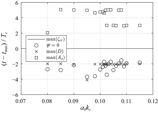 Variations in times of maximum crest height (.), , maximum degree of phase convergence (), and maximum amplitude sum () against initial wave steepness .